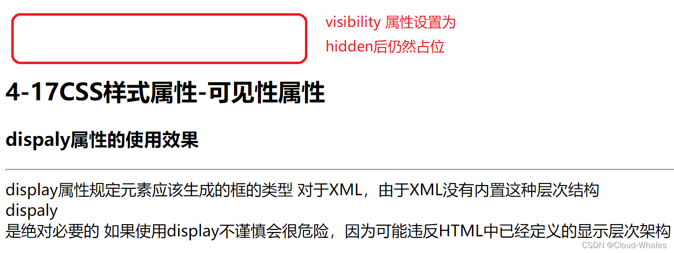 <body><h1>我是被隐藏的h1><h2>4-17CSS样式属性-可见性属性h2><h3>dispaly属性的使用效果h3><hr ><p>display属性规定元素应该生成的框的类型p><p>对于XML,由于XML没有内置这种层次结构<span>dispalyspan>是绝对必要的p><div>本例演示如何把元素显示为内联元素div><p>如果使用display不谨慎会很危险,因为可能违反HTML中已经定义的显示层次架构p>