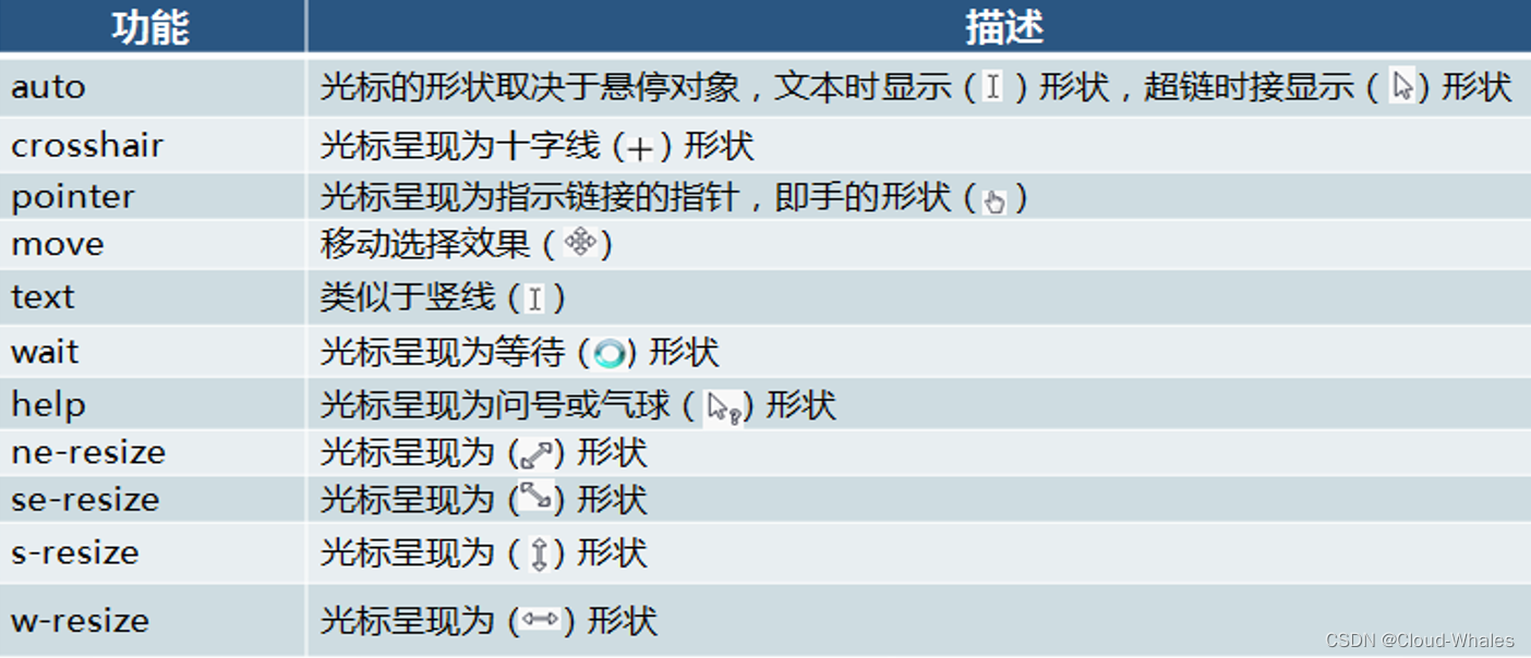 <body><h2>4-16 cursor属性h2><h4>4-16-1 默认属性h4><div><span style="cursor:auto;">cursor:auto;span>div><div><span style="cursor:cell;">cursor:cell;span>div><div><span style="cursor:col-resize;">cursor:col-resize;span>div><div><span style="cursor:context-menu;">cursor:context-menu;span>div><div><span style="cursor:copy;">cursor:copy;span>div><div><span style="cursor:crosshair;">cursor:crosshair;span>div><div><span style="cursor:e-resize;">cursor:e-resize;span>div><div><span style="cursor:ew-resize;">cursor:ew-resizespan>div><div><span style="cursor:n-resize;">cursor:n-resize;span>div><div><span style="cursor:ne-resize;">cursor:ne-resizespan>div><div><span style="cursor:s-resize;">cursor:s-resize;span>div><div><span style="cursor:w-resize;">cursor:w-resize;span>div><div><span style="cursor:col-resize;">cursor:col-resize;span>div><div><span style="cursor:row-resize;">cursor:row-resize;span>div><div><span style="cursor:move;">cursor:move;span>div><div><span style="cursor:wait;">cursor:wait;span>div><div><span style="cursor:pointer;">cursor:pointer;span>div><div><span style="cursor:text;">cursor:text;span>div><h4>4-16-2 外部属性h4><div><span class="arrow">arrowspan>div><div><span class="beam">beamspan>div><div><span class="cross">crossspan>div><div><span class="help">helpspan>div><div><span class="link">linkspan>div><div><span class="move">movespan>div><div><span class="no">nospan>div><div><span class="pen">penspan>div><div><span class="pin">pinspan>div><div><span class="up">upspan>div><div><span class="size1">size1span>div><div><span class="size2">size2span>div><div><span class="size3">size3span>div><div><span class="size4">size4span>div>