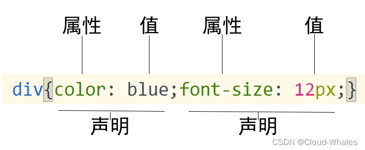 - 大括号内是由属性和值的键值对组成的声明组,键值对间用冒号连接,组间用分号隔开
