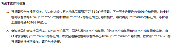 对于384*384的图片,不修改AlexNet的结构使之适应384*384(依然使用原来224x224输入的结构),直到经过汇聚层得到[12x12x512]的数组时,网络运行没有任何问题,按照原来的架构,接下来要将特征图平铺和4096个神经元全连接,这时候就出问题了,因为原架构平铺后是7x7,现在是12x12,无法使用之前的参数矩阵了,如果还需要使用全连接,需要修改全连接的权重参数。还有一种方法是将全连接层转化为卷积层后可继续进行,此时的卷积核小于图片尺寸大小,并最终得到6x6的正确输出,仅仅将网络的全连接层等价转化为卷积层,就能接收更大的图片,这显然方便了很多。