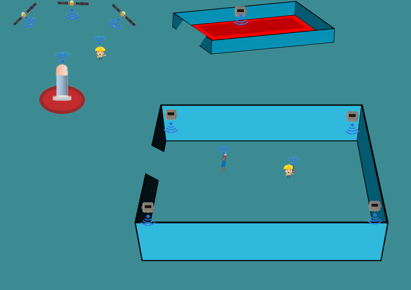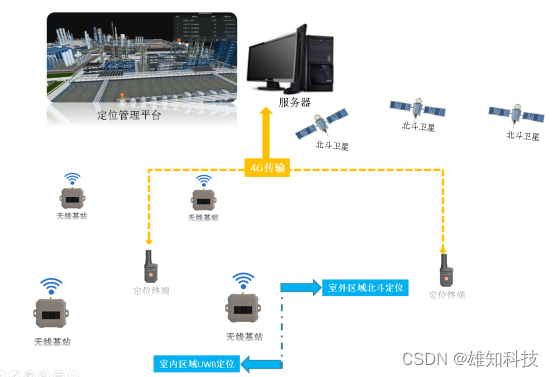 如下图所示,雄知科技设计采用UWB+北斗RTK室内融合定位的方法,室外采用北斗定位,室内区域采用UWB定位,在室内区域部署无线定位基站,室内、室外数据通过4G网络传输到服务器(服务器提供固定IP地址)数据给到定位管理平台软件,在软件上呈现人员位置实现各种功能展示。
