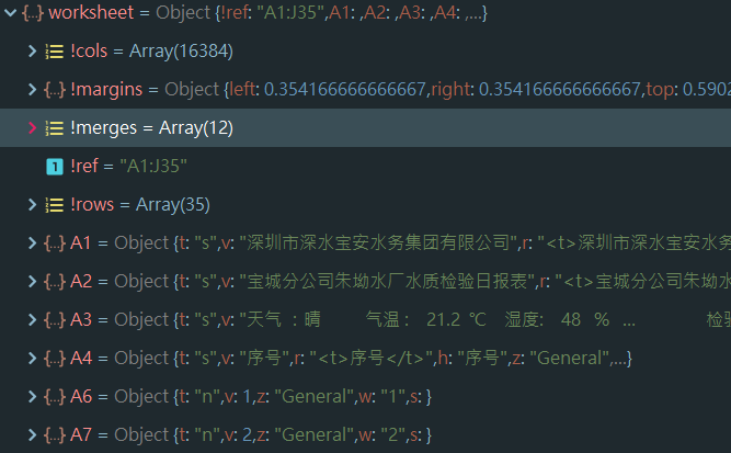 其中"!ref"表示显示的范围,从A1到J35。"!merges"表示那些合并的单元格项,具体数据格式如下: