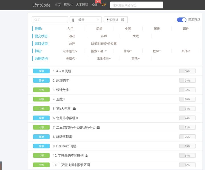 在线编程评测平台,搜集了当前各大IT企业(字节、腾讯、阿里等)技术求职的热门题库,拥有2000多道面试题,可以在这里刷题/准备算法面试,适合初学者或是准备跳槽的朋友。
