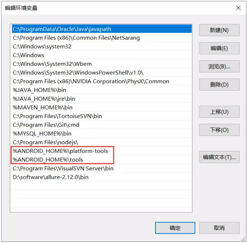 接下来我们就需要把SDK对应的platform-tools目录以及tools配置到系统变量Path里面去:Path里面点击【新建->增加%ANDROID_HOME%\platform-tools以及%ANDROID_HOME% ools】