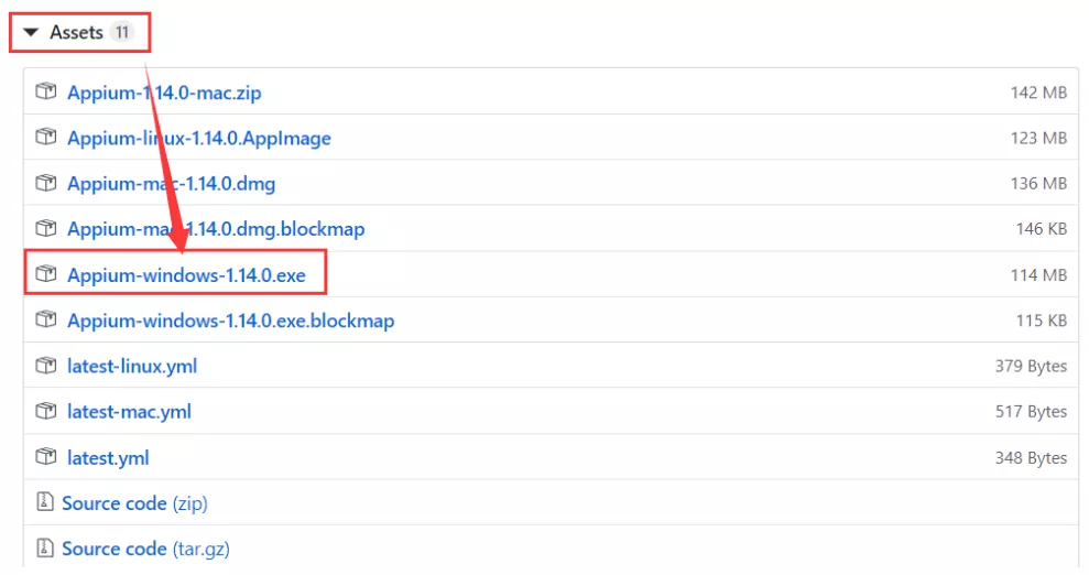 进入到安装包的下载地址,下载Appium-desktop的对应版本安装包(这里建议不要用最新的,可能会存在一些BUG),这里以V1.14.0为例:展开Assets选项,选择windows平台的安装包