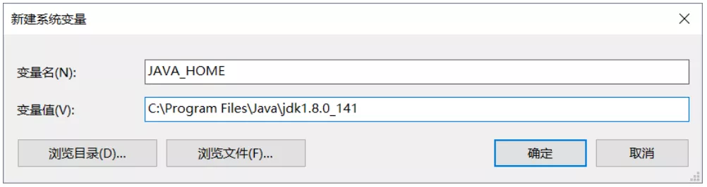 点击新建,在弹出框中变量值填写jdk安装的根目录(即上面记录下来的C:\Program Files\Java\jdk1.8.0_141),如下图示: