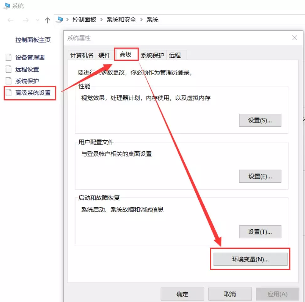 打开环境变量设置窗口:打开开始菜单→右键计算机→系统属性→高级系统设置→高级→环境变量。
