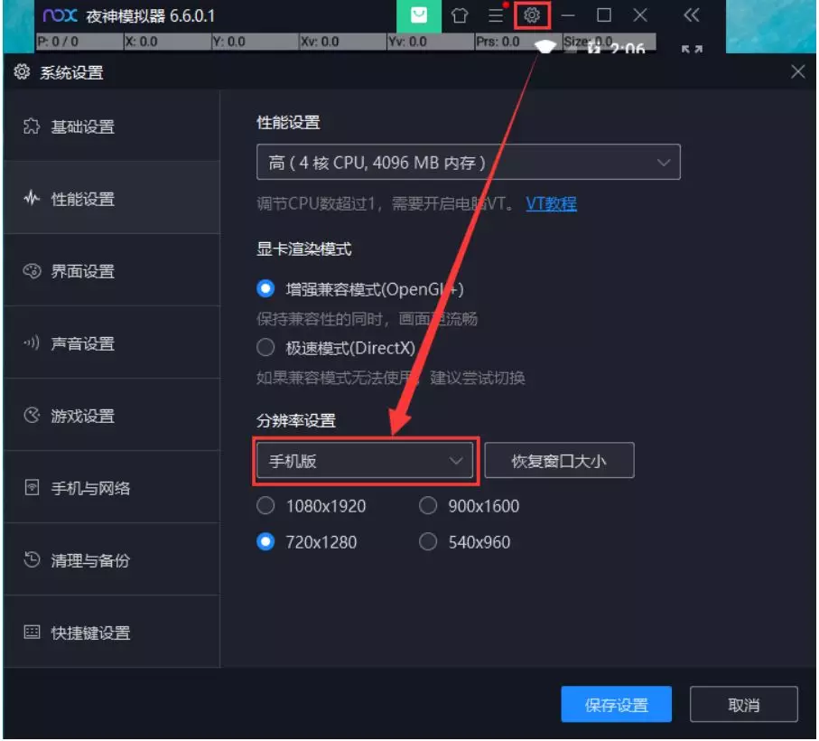 夜神模拟器设置->性能设置->分辨率设置->选择手机版即可