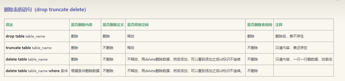 使用场景:不需要该表时,删除多余表或重复的表。(慎用,一般不删表,只清表数据)