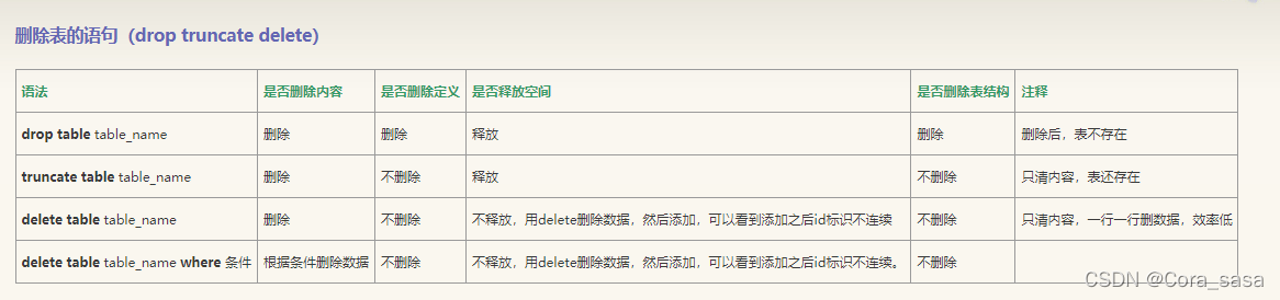 使用场景:将表内的数据,进行清空。效率较低,一行行删除,不推荐使用