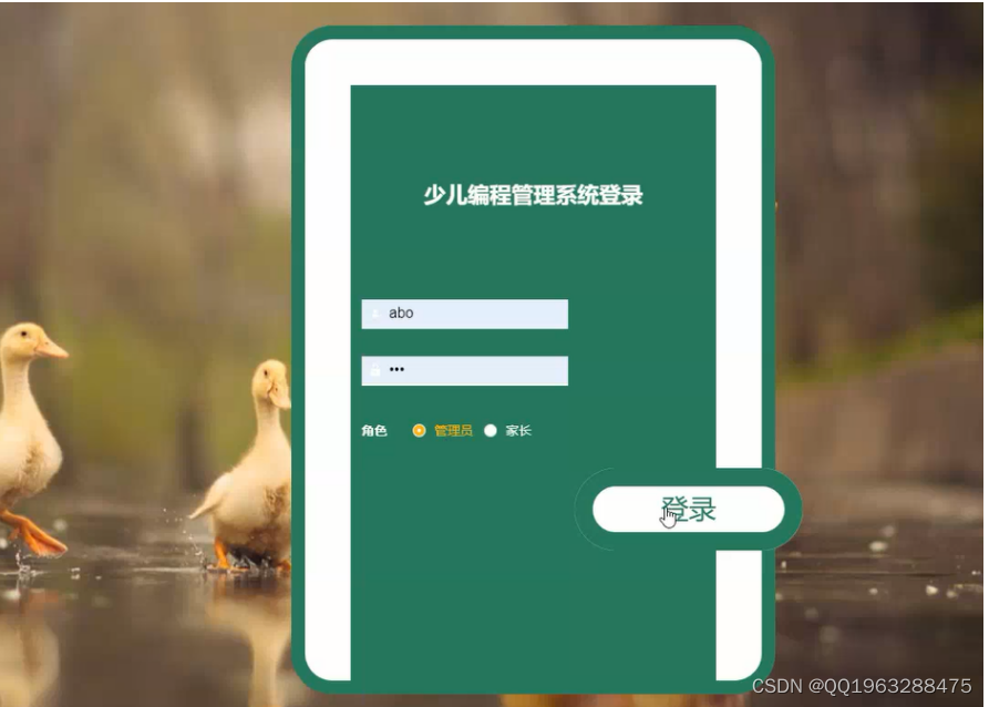 后台登录,管理员和家长进入系统前在登录页面根据要求填写账号,密码和选择角色等信息,点击登录进行登录操作