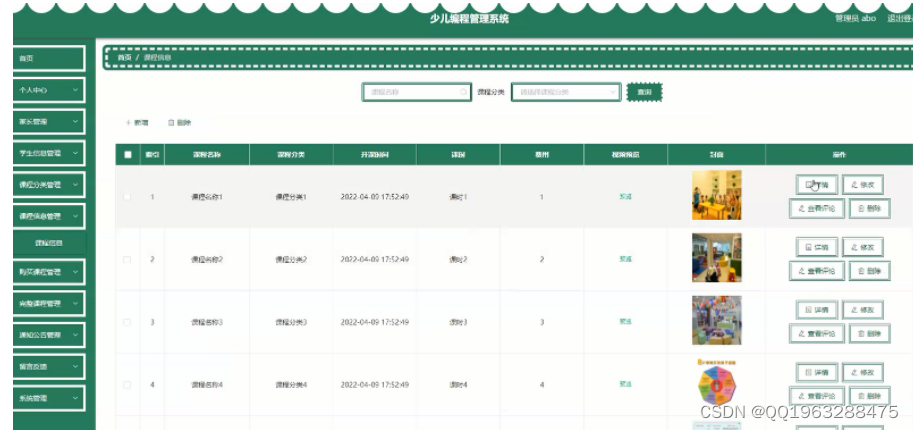 课程信息管理,在课程信息管理页面可以对索引、课程名称、课程分类、开课时间、课时、费用、视频预览、封面等内容进行详情,修改,查看评论和删除等操作
