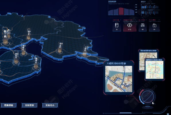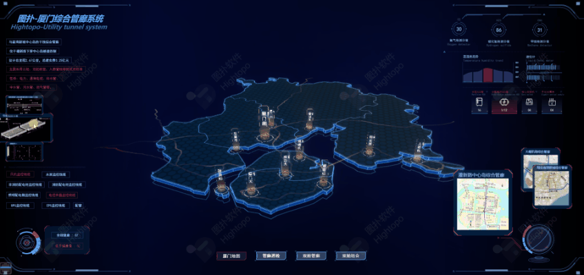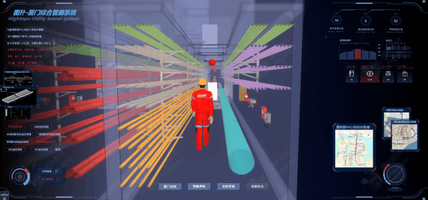 Hightopo 3D可视化综合管廊系统摒弃传统运维管理模式的缺陷,打造“绿色管廊监管运维一体化”体系。全面提升运维管理的智能化水平,以实现感知、决策、管理等全面智慧化综合管廊为准则,保障地下综合管廊安全运行,从而提高城市绿色化、精细化、智能化管理水平,实现对管廊的集中统一管理。