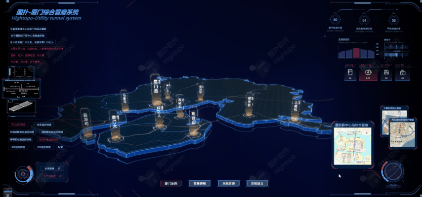 加载界面可显示管廊布局的整体地图,两侧为监测数据。展现城市整体综合管廊的三维景观,对管廊主体、管线、设备等三维模型数据进行显示、编辑和存储。