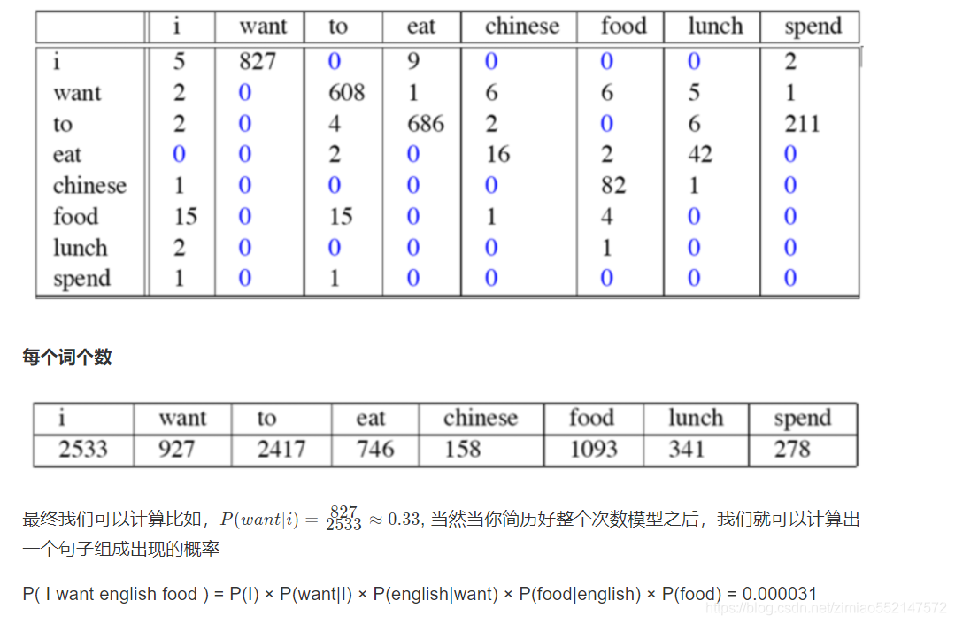 这个例子来自大一点的语料库,为了计算对应的二元模型的参数。即P(wi | wi-1),我们要先计数即c(wi-1,wi),然后计数c(wi-1),再用除法可得到这些条件概率。