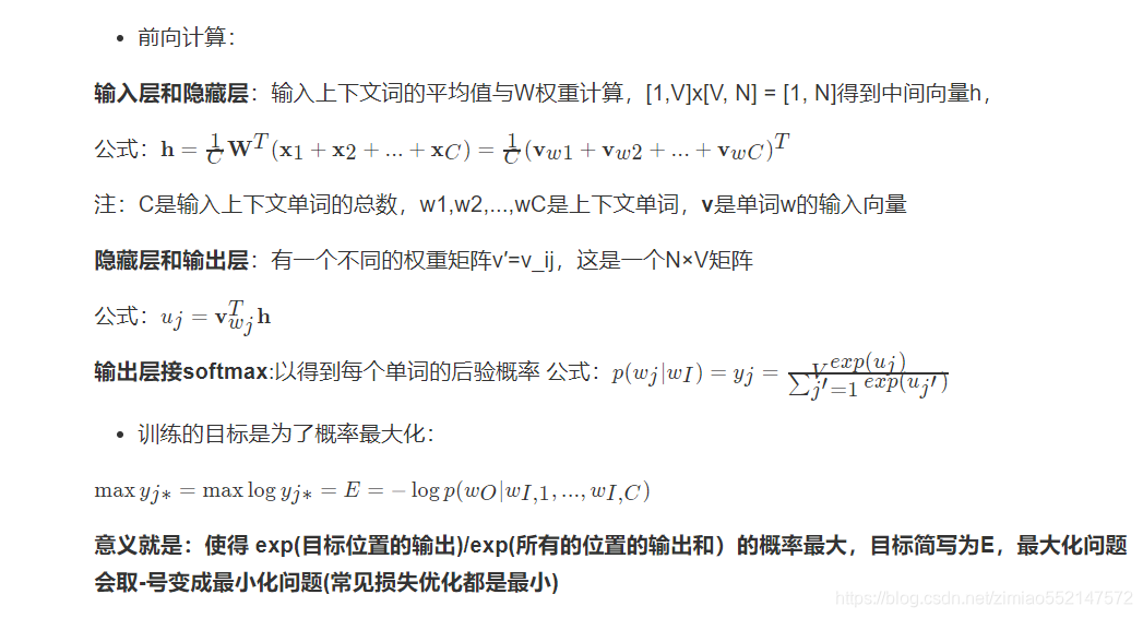 CBOW与2003年Bengio的结构有些不同,不同点在于CBOW去掉了最耗时的非线性隐层、并且所有词共享隐层。该推导公式不包含下面的分层softmax与负采样优化过程!!!