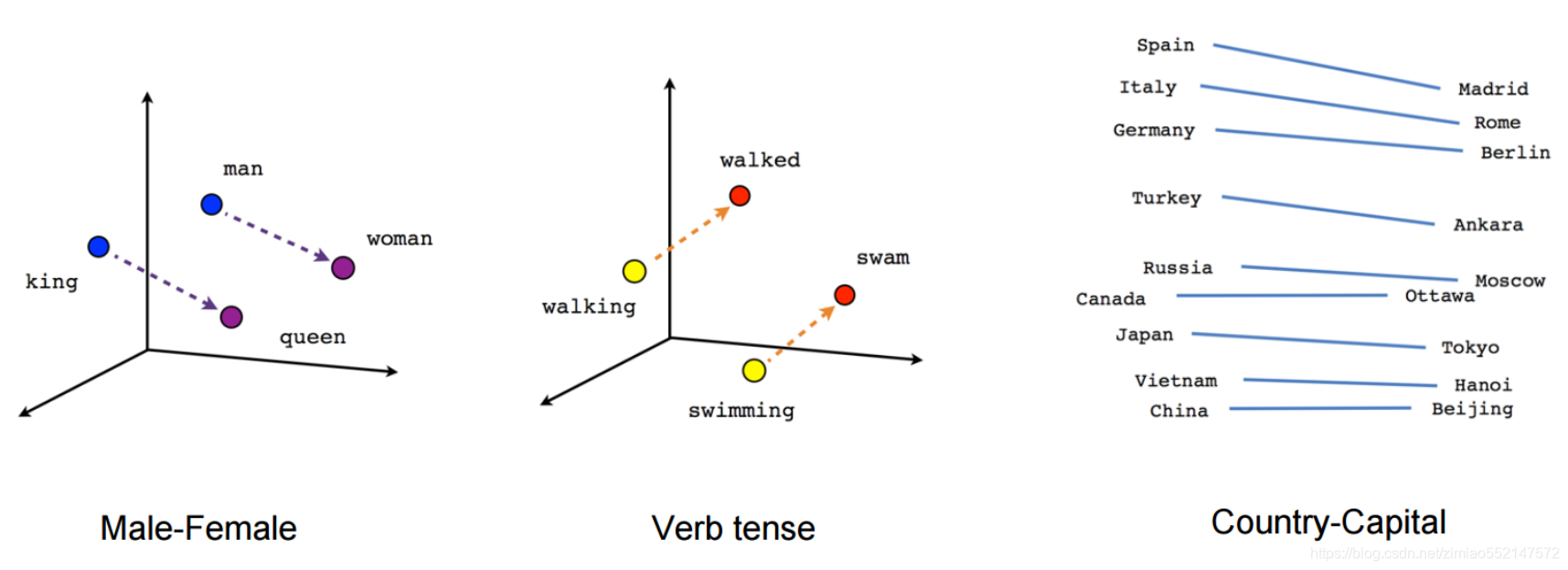 我们可以可视化学到的向量,方法是使用(t-SNE降维)等技术将它们投射到二维空间。在检查这些可视化效果时,这些向量很明显捕获了一些关于字词及其相互关系的一般语义信息,而且这些语义信息实际上非常有用。第一次发现诱导向量空间中的某些方向专门表示了字词之间特定的语义关系,例如男性-女性、动词时态,甚至国家/地区-首都关系。https://distill.pub/2016/misread-tsne/