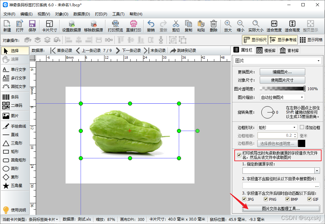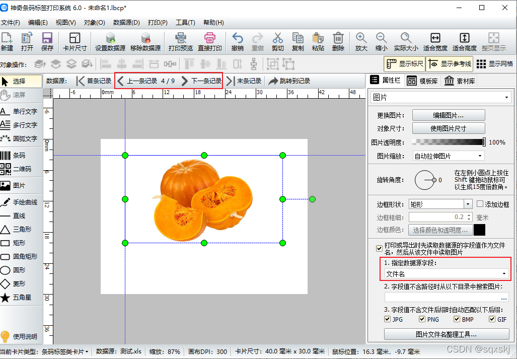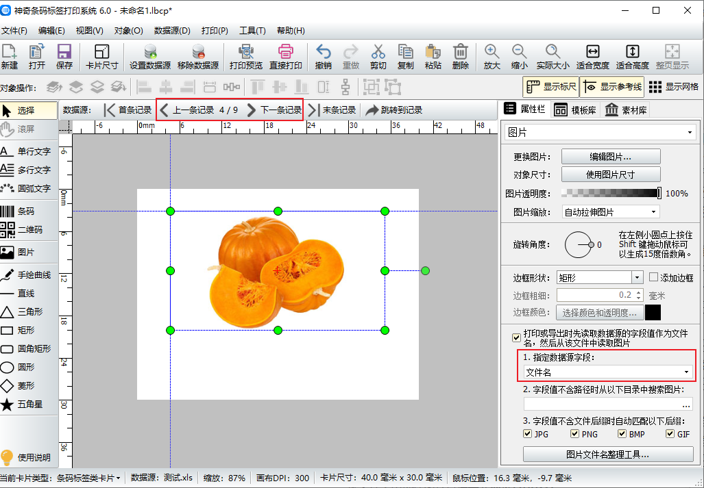 在软件右侧指定数据源字段处选择“文件名”,点击上一条记录或下一条记录可以查看图片的导入情况。