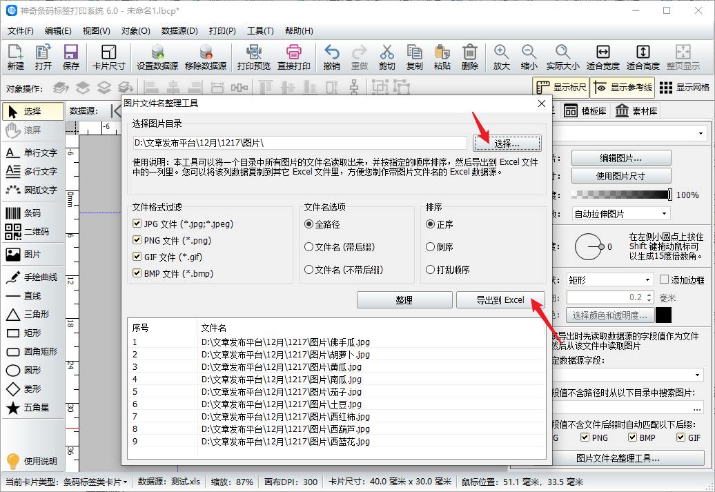 图片添加完成后,先在软件右侧勾选“打印或导出时先读取数据源的字段值作为文件名,然后从该文件中读取图片”。然后点击底部的“图片文件名整理工具”。