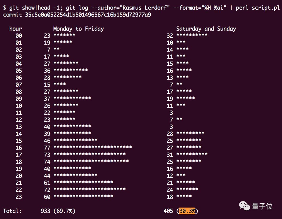 PHP 创始人 Lerdorf,是所有被测的著名程序员里,周末提交比例最高的,达到了 30.3%。