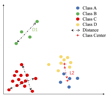 Dcenter表示在所有类别中,选择2个不同类别中心距离最短的,即类别Q和类别R是所有距离中最短的。