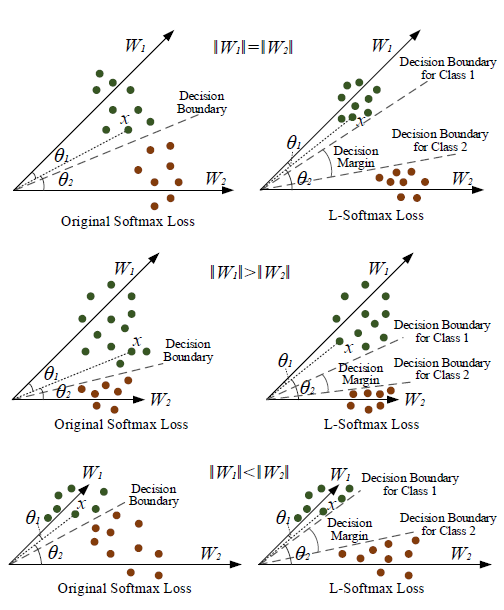 (2)引入乘性margin m(cos函数内部),当m=1时,为softmax