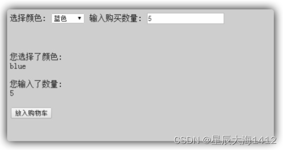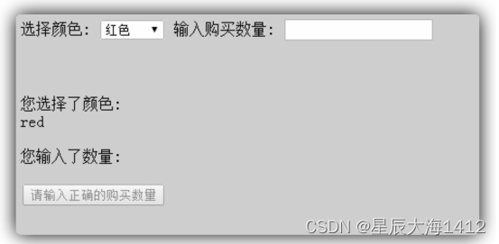 numberInput.oninput = function(){var color = colorSelect.value, // 颜色number = this.value, //数量stock = goods[ color ]; // 该颜色手机对应的当前库存numberInfo.innerHTML = number;if ( !color ){nextBtn.disabled = true;nextBtn.innerHTML = '请选择手机颜色';return;}if ((( number - 0) | 0)!== number - 0){ // 输入购买数量是否为正整数nextBtn.disabled = true;nextBtn.innerHTML = '请输入正确的购买数量';return;}if (number > stock ){//当前选择数量没有超过库存量nextBtn.disabled = true;nextBtn.innerHTML = '库存不足';return ;}nextBtn.disabled = false;nextBtn.innerHTML = '放入购物车 ;