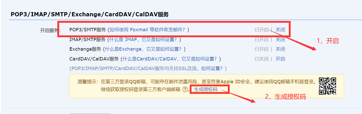 登录QQ邮箱后,设置——>账户——>POP3/IMAP/SMTP/Exchange/CardDAV/CalDAV服务——>