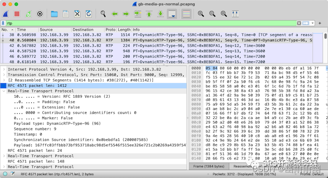 解析成功后,直接过滤rtp包,可以看到GB的媒体数据,如下图所示: