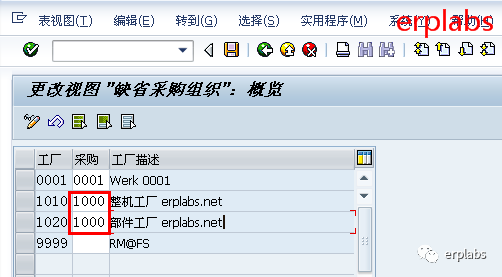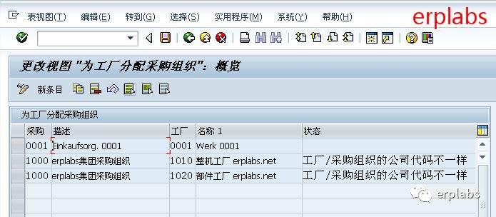 点新条目输入1000采购组织对应1010和1020工厂。本案例采用集中采购模式,一个采购组织可以为多个工厂采购。