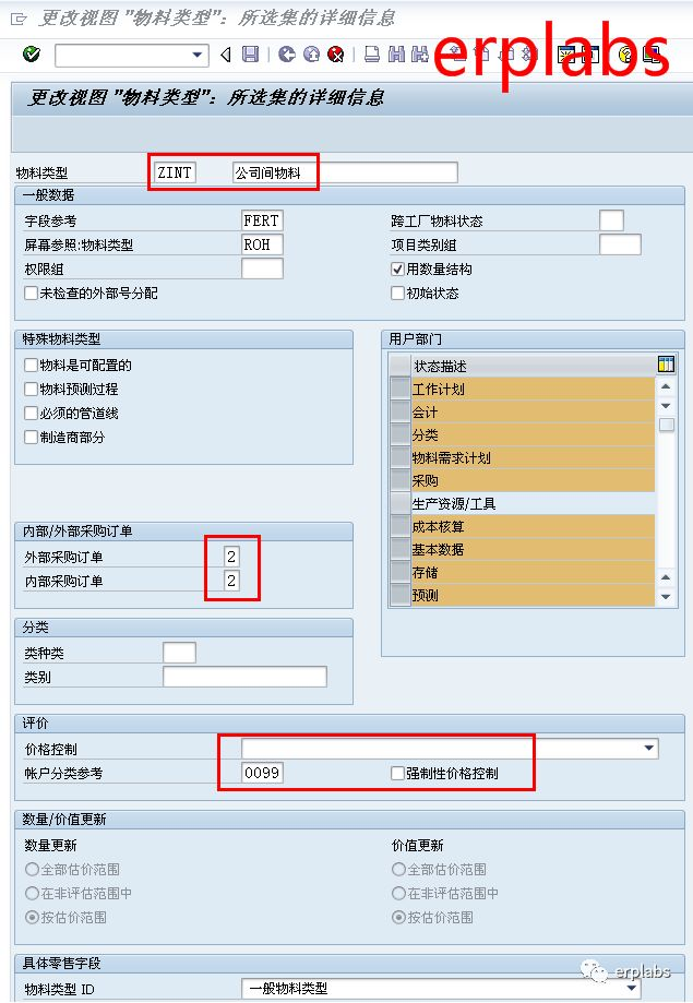 复制ROH原材料,物料类型输入Z开头ZINT 公司间物料(整机公司和部件公司共用物料类型),物料视图须选中采购和工作计划,价格控制设置为空,帐户分类参考输入自定义的0099公司间物料参考,其它如图设置,保存。