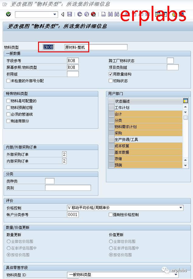 复制ROH原材料,物料类型输入Z开头ZROH 原材料-整机(整机公司原材料类型),原材料物料视图须选中采购,价格控制选择V移动平均价,帐户分类参考输入0001,其它如图设置,保存。