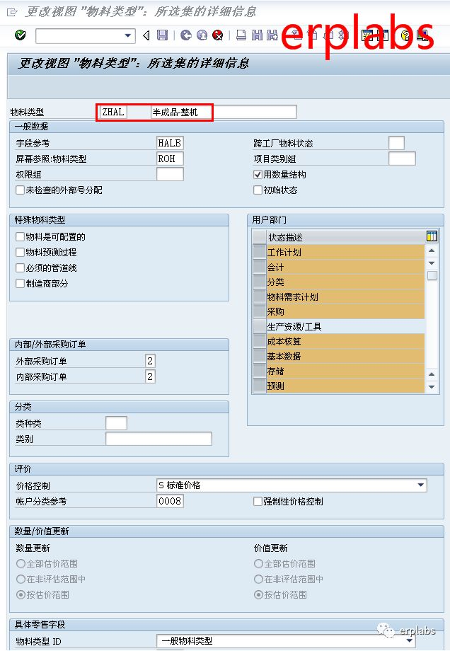 复制HALB半成品,物料类型输入Z开头ZHAL 半成品-整机(整机公司半成品类型),半成品物料视图须选中工作计划,价格控制选择S标准价格,帐户分类参考输入0008,其它如图设置,保存。