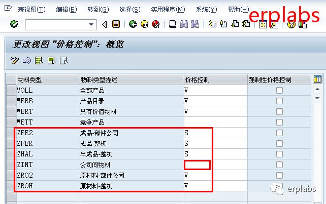 ZFER、ZFE2成品、ZHAL半成品设置S标准价格,ZROH、ZRO2原材料设置V移动平均价,ZINT公司间物料设置空白,本案例公司间物料在部件公司是成品采用S价,在整机公司是原材料采用V价。