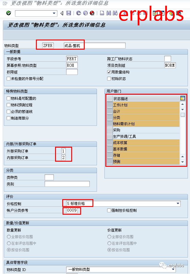 物料类型输入Z开头ZFER 成品-整机(整机公司成品类型),成品物料视图须选中工作计划,价格控制选择S标准价格,帐户分类参考输入0009,其它如图设置,保存。
