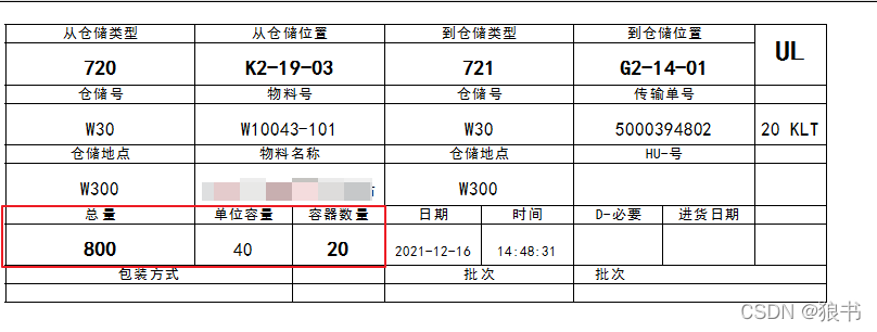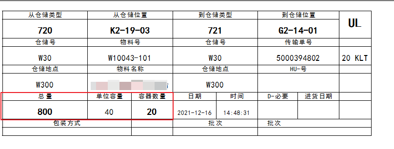 公司SAP仓库管理中原材料高底位货架补货数量确定逻辑。这个补货动作是由增强程序控制的,大致情况是当低位货架存货数量低于某个设定值时,自动触发高位货架向低位货架补货系统流程。系统会形成一个补货指令,以打印补货单的形式来实现。样板如下: