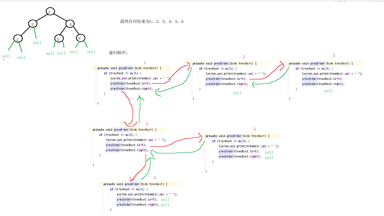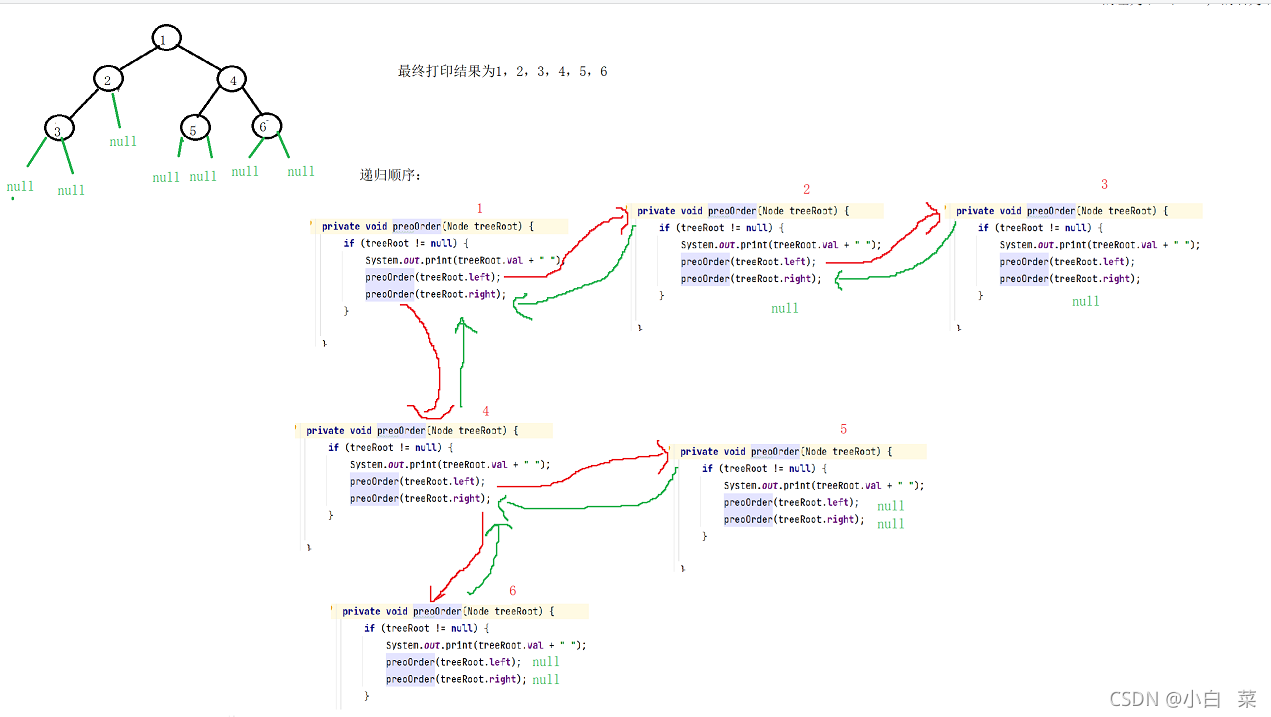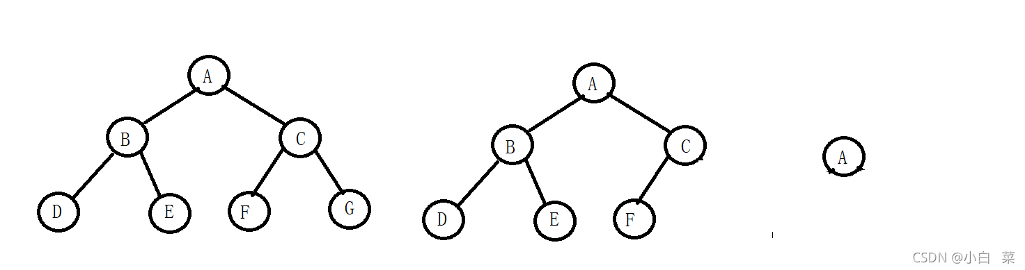 (1) 若规定根结点的层数为1,则一棵非空二叉树的第i层上最多有 二叉树的存储分为顺序存储和链式存储。 其中的链式存储是根据一个一个的结点引用来进行连接,下面关于二叉树的一些基本操作是根据孩子表示法来进行存储的。 1.二叉树的创建 这里对于二叉树的创建是根据所给的前序遍历结果的数组中的值来进行创建的 2.递归遍历二叉树 前序遍历:访问根结点--->根的左子树--->根的右子树 先将跟的结果进行打印,然后递归接着往左子树中找根结点,左子树遍历完后再往右子树中重新开始根左右的操作即可。 前序遍历递归示意图: 中序遍历:根的左子树--->根节点--->根的右子树 后序遍历:根的左子树--->根的右子树--->根节点 中序和后序示意图和上面类似,只不过执行的顺序不同。