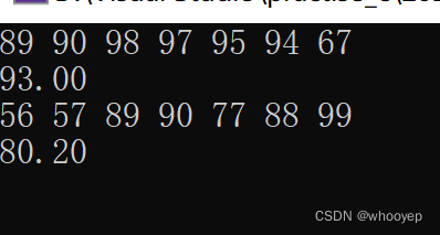 {int i = 0;int score = 0;int max = 0;int min = 100;int sum = 0;while (scanf("%d", &score) != EOF){i++;if (score > max){max = score;}if (score < min){min = score;}sum += score;if (i == 7){printf("%.2f\n", (sum - min - max) / 5.0);i = 0;sum = 0;max = 0;min = 100;}}return 0;