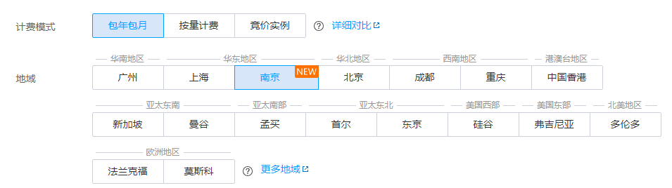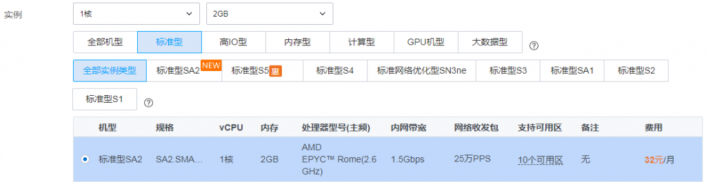 选完地域,接着我们选择配置,也就是我们理解的cpu和内存选择,同样这也是根据你的业务需求来选择的,在前期,刚上线的网站是不会出现大量访问情况的,所以我选择的是1 vCPU 和 2Gib内存类型,这个对一般的小站点来说已经足够。