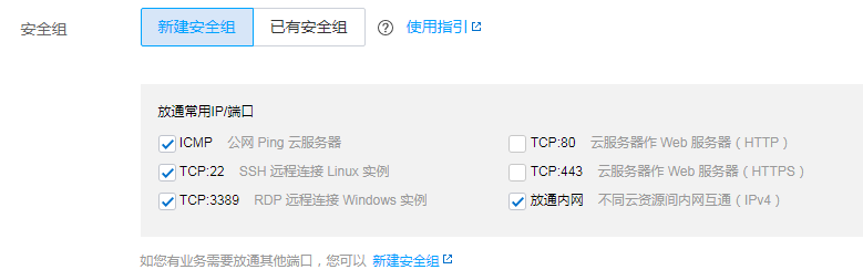 安全组是我们必须选择的,如果我们账户已经有自己设置过的安全组,可以选择已有安全组,如果没有直接选择新建安全组即可,新建安全组里面的端口都是一些常用的端口,我们全部勾选就行。