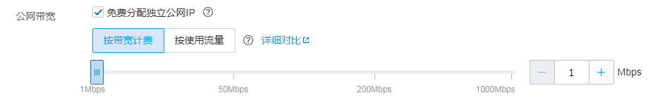带宽选择最低为1M,最高为100M,配置越高相应的选择的带宽也应越高,因为我们配置选择的是1核2G,对应的带宽基本上选择1-2M就足够了。