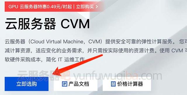 在云服务器CVM官方页面,点击“立即选购”,如下图: