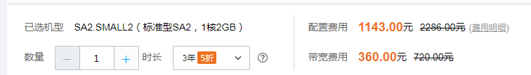 如果是长期使用,我建议大家时间选择1年,非常划算。我自己购买是直接选择了3年的购买时间,费用是打折之后1143元配置费用和360元的带宽费用。