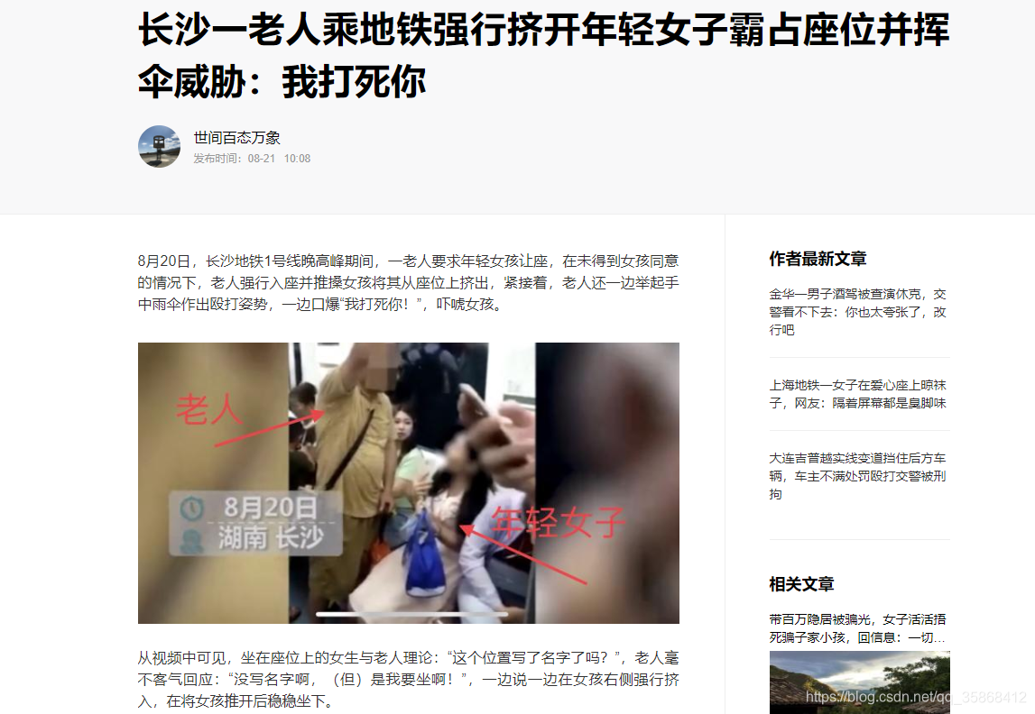 前几天,我看到新闻上有个老人在地铁上,让一个女生给她让座,女生不肯让座,他就骂那个女生,然后还直接霸占了女生的座位,旁边的乘客纷纷说道,“让座也得别人女生同意才行,别人不同意你也不能霸占人家的座位”。但是老人却不以为然,甚至还威胁女生..........