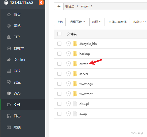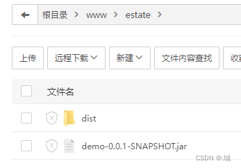 3)在文件中创建你的项目文件夹并上传文件(我的文件包括前端vue的打包文件和后端Java的jar包)