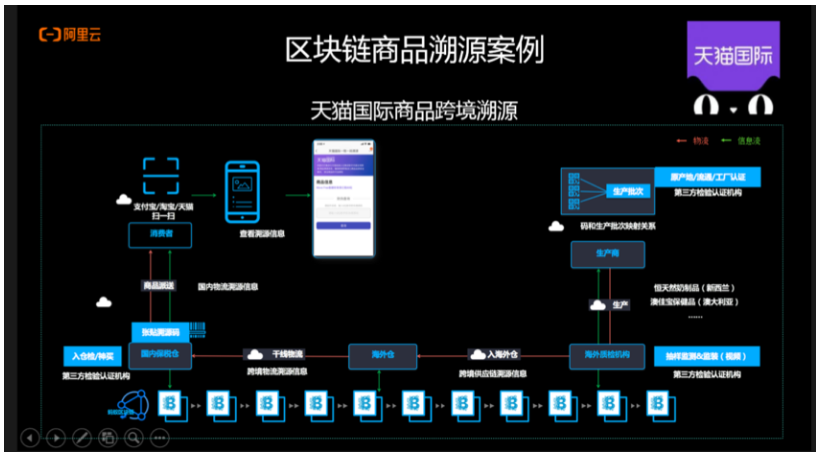 阿里云、蚂蚁区块链联合支付宝和天猫,实现了商品跨境溯源平台。通过全球商家和货品标准化档案、商品身份识别体系,实现了商品的可信追溯。以数据采集为例,通过带有区块链硬件加密模块的双频全协议RFID PDA,实现产品的激活、装箱、仓库、出入关、销售等环节信息的自动化采集,同步实时将设备采集到的信息直接上传至区块链,整个过程通过硬件设备和区块链技术实现数据来源的不可篡改及可信。