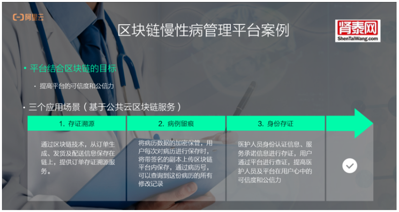 同时,阿里云BaaS客户肾泰网深耕慢性肾病领域,是对接多方的互联网医疗生态垂直服务平台,肾泰网将区块链技术应用在订单追溯、病例留痕、医护人员身份及承诺存证等场景,