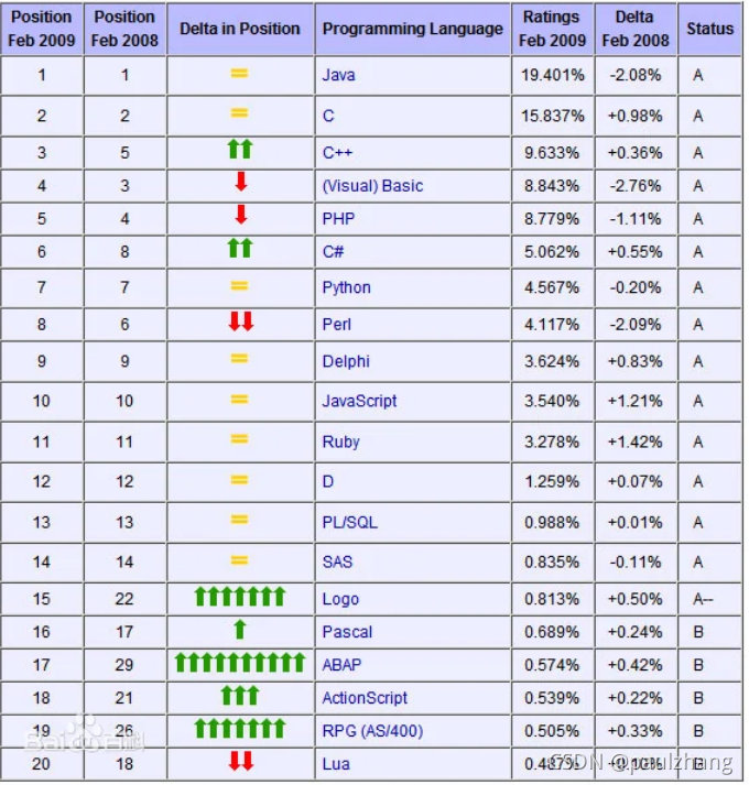 先不说语⾔的发展是很快的,每隔五年⼗年就会有新的语⾔产⽣,就当前,编程语言多如牛毛,流行度排行榜也是上上下下,每年都有不同的变化。下表是2020年世界编程语言排行榜: