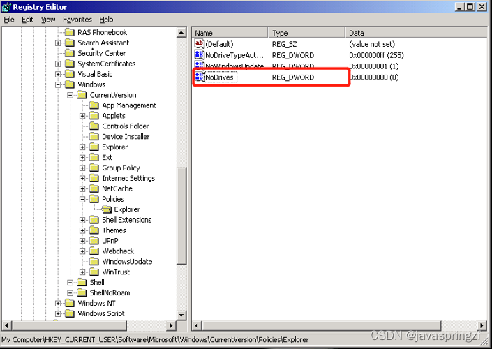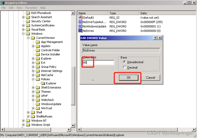 第十二步:双击打开NoDrives文件,输入ff0,点击OK