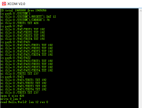 res =f_mount(&fs,"0:",1); //挂载SD卡 if(res){}else{exf_getfree("0",&total,&free);printf("SD total %d free %d\r\n",total,free);}scan_files("0:");res = f_open(&fil, "0:/test1.txt",FA_OPEN_APPEND|FA_WRITE|FA_READ);printf("open %d size %d\r\n",res,f_size(&fil));res = f_write(&fil, wrbuf, sizeof(wrbuf), &bw);printf("write %d len %d\r\n",res,bw);f_lseek(&fil,0);res = f_read(&fil,mm,12,&read_len);printf("read %s len %d res %d\r\n",(char*)mm,read_len,res);f_close(&fil);/*卸载文件系统*/f_mount(0, "0:", 0);
